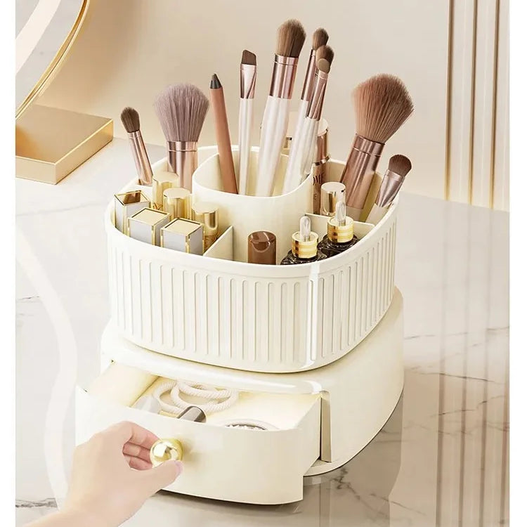 The Double Rotating Makeup Brush Organizer is truly multifunctional. It serves as both a storage solution and a decorative piece for your beauty space. Its rotating upper section maximizes accessibility, while the lower drawer adds extra storage capacity. This multifunctional design ensures that all your beauty essentials are within reach and neatly organized.